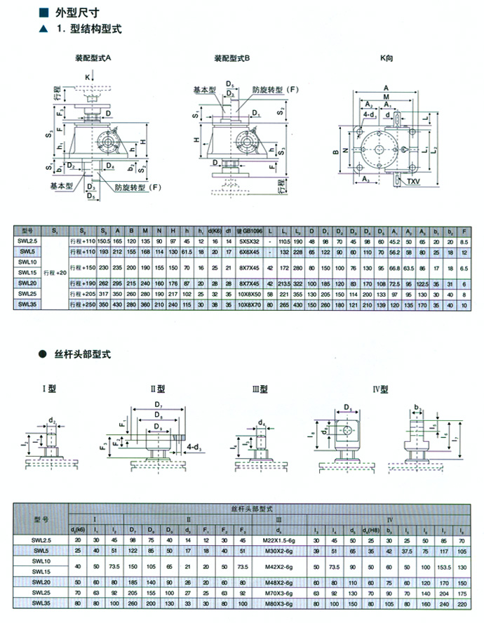 1型结构型式的丝杆头部为Ⅰ型(圆柱型)、Ⅱ型(法兰型)、Ⅲ型(螺纹型)Ⅳ型(扁头型)四种型式。